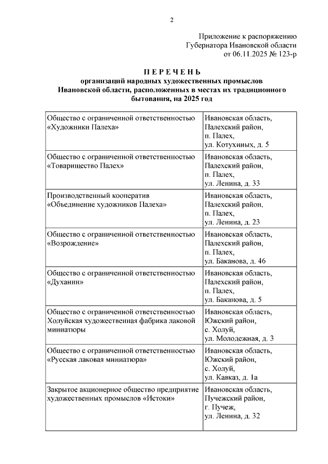 Распоряжение Губернатора Ивановской области от 06.11.2025 N 123-р "Об утверждении перечня организаций народных художественных промыслов Ивановской области, расположенных в местах их традиционного бытования, на 2025 год"