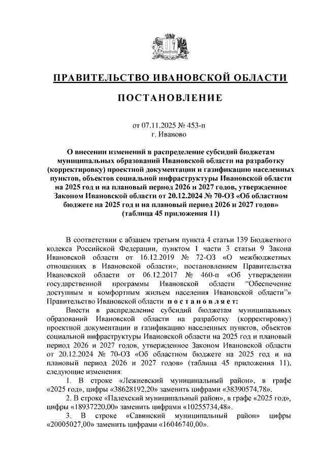 Постановление Правительства Ивановской области от 07.11.2025 N 453-п "О внесении изменений в распределение субсидий бюджетам муниципальных образований Ивановской области на разработку (корректировку) проектной документации и газификацию населенных пунктов, объектов социальной инфраструктуры Ивановской области на 2025 год и на плановый период 2026 и 2027 годов, утвержденное Законом Ивановской области от 20.12.2024 N 70-ОЗ "Об областном бюджете на 2025 год и на плановый период 2026 и 2027 годов" (таблица 45 приложения 11)"