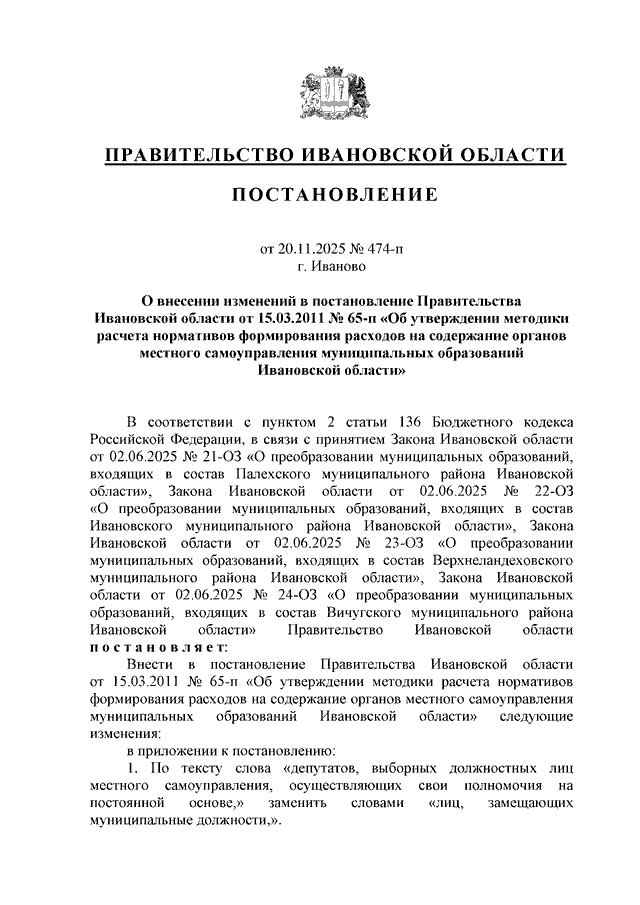 Постановление Правительства Ивановской области от 20.11.2025 N 474-п "О внесении изменений в постановление Правительства Ивановской области от 15.03.2011 N 65-п "Об утверждении методики расчета нормативов формирования расходов на содержание органов местного самоуправления муниципальных образований Ивановской области"