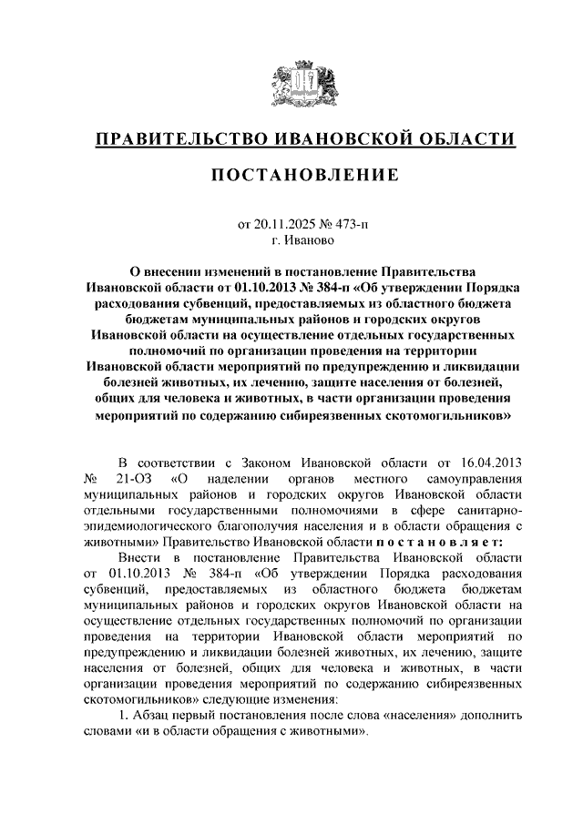 Постановление Правительства Ивановской области от 20.11.2025 N 473-п "О внесении изменений в постановление Правительства Ивановской области от 01.10.2013 N 384-п "Об утверждении Порядка расходования субвенций, предоставляемых из областного бюджета бюджетам муниципальных районов и городских округов Ивановской области на осуществление отдельных государственных полномочий по организации проведения на территории Ивановской области мероприятий по предупреждению и ликвидации болезней животных, их лечению, защите населения от болезней, общих для человека и животных, в части организации проведения мероприятий по содержанию сибиреязвенных скотомогильников"