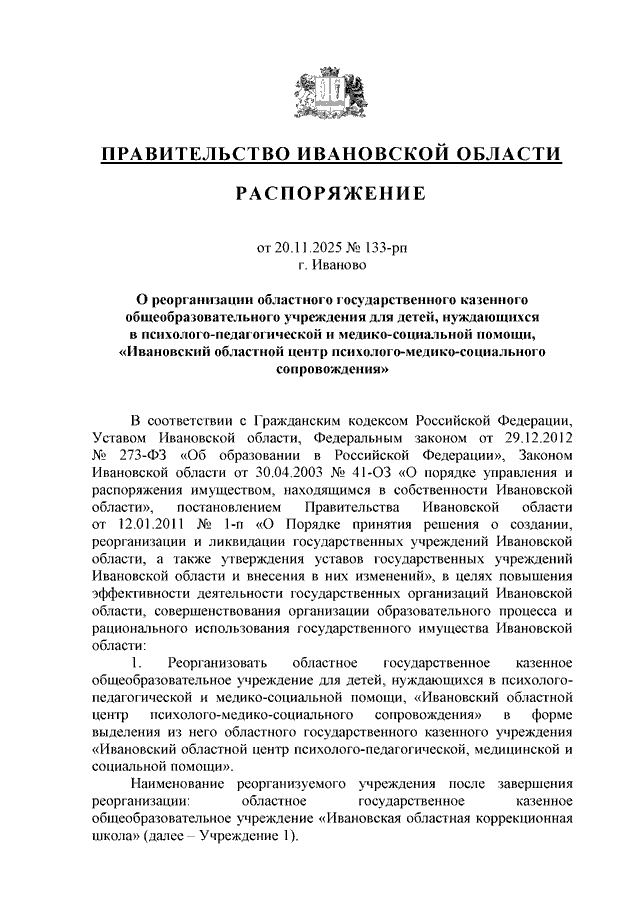 Распоряжение Правительства Ивановской области от 20.11.2025 N 133-рп "О реорганизации областного государственного казенного общеобразовательного учреждения для детей, нуждающихся в психолого-педагогической и медико-социальной помощи, "Ивановский областной центр психолого-медико-социального сопровождения"