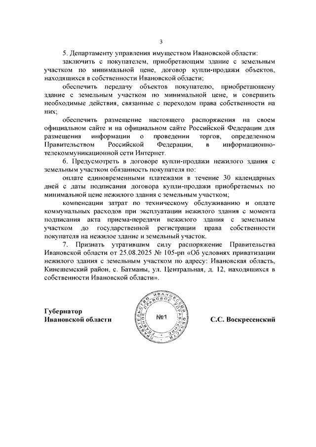 Распоряжение Правительства Ивановской области от 20.11.2025 N 134-рп "Об условиях приватизации нежилого здания с земельным участком по адресу: Ивановская область, Кинешемский район, с. Батманы, ул. Центральная, д. 12, находящихся в собственности Ивановской области"