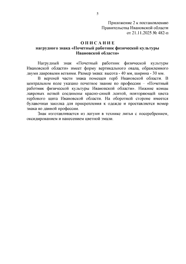 Постановление Правительства Ивановской области от 21.11.2025 N 482-п "О звании "Почетный работник физической культуры Ивановской области" (вместе с "Положением о звании "Почетный работник физической культуры Ивановской области")