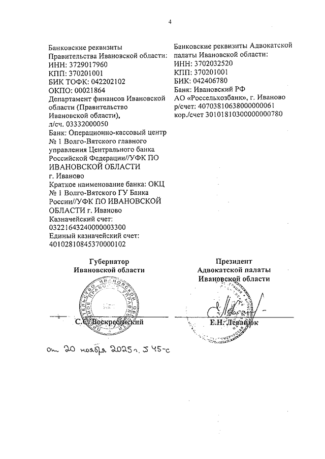 "Соглашение об оказании бесплатной юридической помощи адвокатами, являющимися участниками государственной системы бесплатной юридической помощи" (Заключено в г. Иваново 20.11.2025 N 45-с) (вместе со "Списком адвокатов Ивановской области, участвующих в деятельности государственной системы бесплатной юридической помощи")