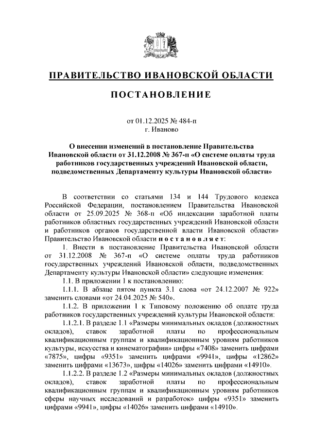 Постановление Правительства Ивановской области от 01.12.2025 N 484-п "О внесении изменений в постановление Правительства Ивановской области от 31.12.2008 N 367-п "О системе оплаты труда работников государственных учреждений Ивановской области, подведомственных Департаменту культуры Ивановской области"