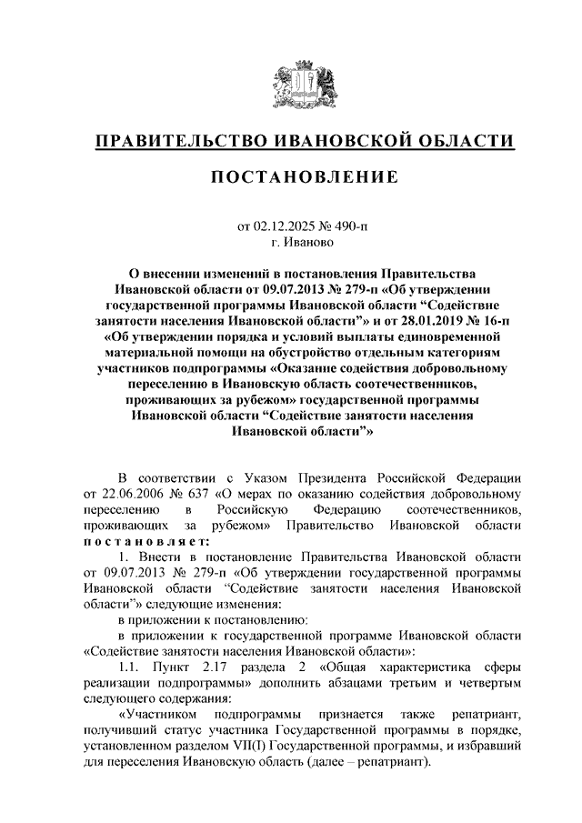 Постановление Правительства Ивановской области от 02.12.2025 N 490-п "О внесении изменений в постановления Правительства Ивановской области от 09.07.2013 N 279-п "Об утверждении государственной программы Ивановской области "Содействие занятости населения Ивановской области" и от 28.01.2019 N 16-п "Об утверждении порядка и условий выплаты единовременной материальной помощи на обустройство отдельным категориям участников подпрограммы "Оказание содействия добровольному переселению в Ивановскую область соотечественников, проживающих за рубежом" государственной программы Ивановской области "Содействие занятости населения Ивановской области"