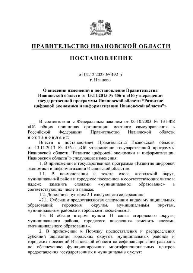 Постановление Правительства Ивановской области от 02.12.2025 N 492-п "О внесении изменений в постановление Правительства Ивановской области от 13.11.2013 N 456-п "Об утверждении государственной программы Ивановской области "Развитие цифровой экономики и информатизации Ивановской области"
