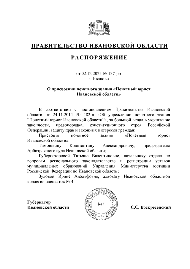 Распоряжение Правительства Ивановской области от 02.12.2025 N 137-рп "О присвоении почетного звания "Почетный юрист Ивановской области"