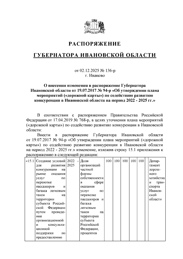 Распоряжение Губернатора Ивановской области от 02.12.2025 N 136-р "О внесении изменения в распоряжение Губернатора Ивановской области от 19.07.2017 N 94-р "Об утверждении плана мероприятий ("дорожной карты") по содействию развитию конкуренции в Ивановской области на период 2022 - 2025 гг."