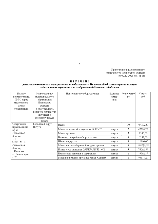 Распоряжение Правительства Ивановской области от 02.12.2025 N 141-рп "О передаче движимого имущества из собственности Ивановской области в муниципальную собственность муниципальных образований Ивановской области"
