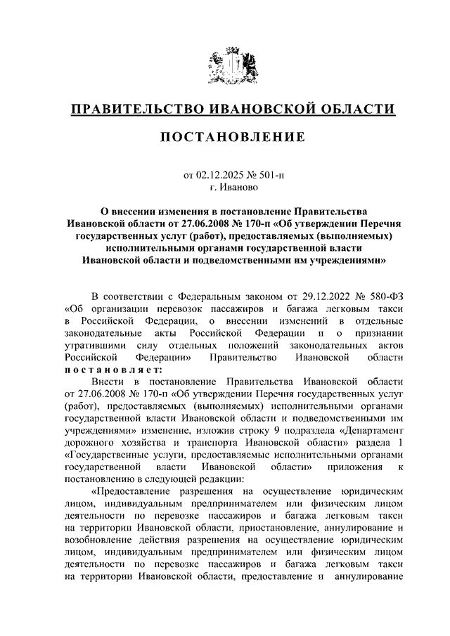 Постановление Правительства Ивановской области от 02.12.2025 N 501-п "О внесении изменения в постановление Правительства Ивановской области от 27.06.2008 N 170-п "Об утверждении Перечня государственных услуг (работ), предоставляемых (выполняемых) исполнительными органами государственной власти Ивановской области и подведомственными им учреждениями"