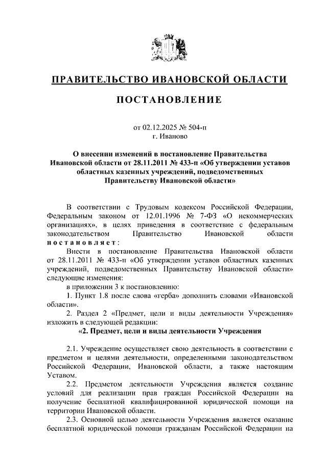 Постановление Правительства Ивановской области от 02.12.2025 N 504-п "О внесении изменений в постановление Правительства Ивановской области от 28.11.2011 N 433-п "Об утверждении уставов областных казенных учреждений, подведомственных Правительству Ивановской области"