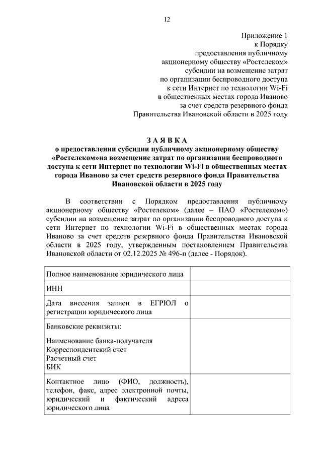Постановление Правительства Ивановской области от 02.12.2025 N 496-п "Об утверждении Порядка предоставления публичному акционерному обществу "Ростелеком" субсидии на возмещение затрат по организации беспроводного доступа к сети Интернет по технологии Wi-Fi в общественных местах города Иваново за счет средств резервного фонда Правительства Ивановской области в 2025 году" (вместе с "Перечнем общественных мест города Иваново, на которых осуществляется организация беспроводного доступа к сети Интернет по технологии Wi-Fi")