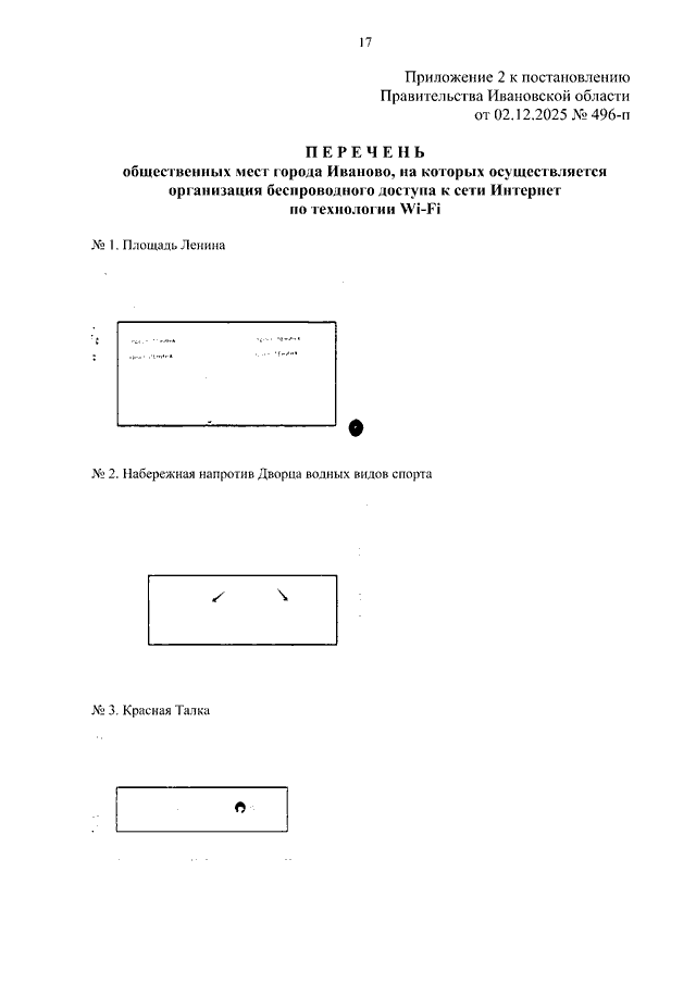 Постановление Правительства Ивановской области от 02.12.2025 N 496-п "Об утверждении Порядка предоставления публичному акционерному обществу "Ростелеком" субсидии на возмещение затрат по организации беспроводного доступа к сети Интернет по технологии Wi-Fi в общественных местах города Иваново за счет средств резервного фонда Правительства Ивановской области в 2025 году" (вместе с "Перечнем общественных мест города Иваново, на которых осуществляется организация беспроводного доступа к сети Интернет по технологии Wi-Fi")