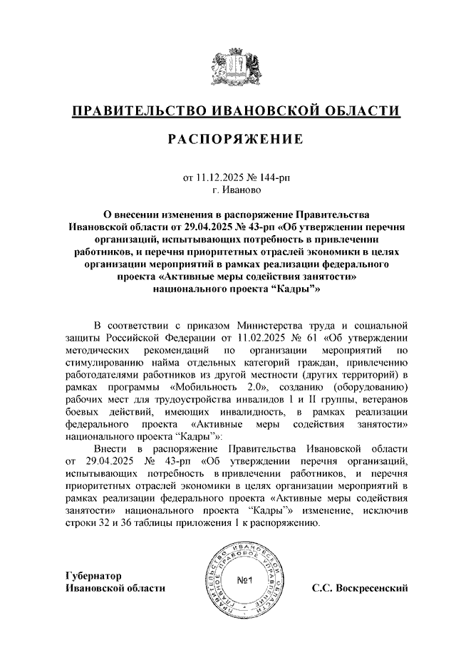 Распоряжение Правительства Ивановской области от 11.12.2025 N 144-рп "О внесении изменения в распоряжение Правительства Ивановской области от 29.04.2025 N 43-рп "Об утверждении перечня организаций, испытывающих потребность в привлечении работников, и перечня приоритетных отраслей экономики в целях организации мероприятий в рамках реализации федерального проекта "Активные меры содействия занятости" национального проекта "Кадры"