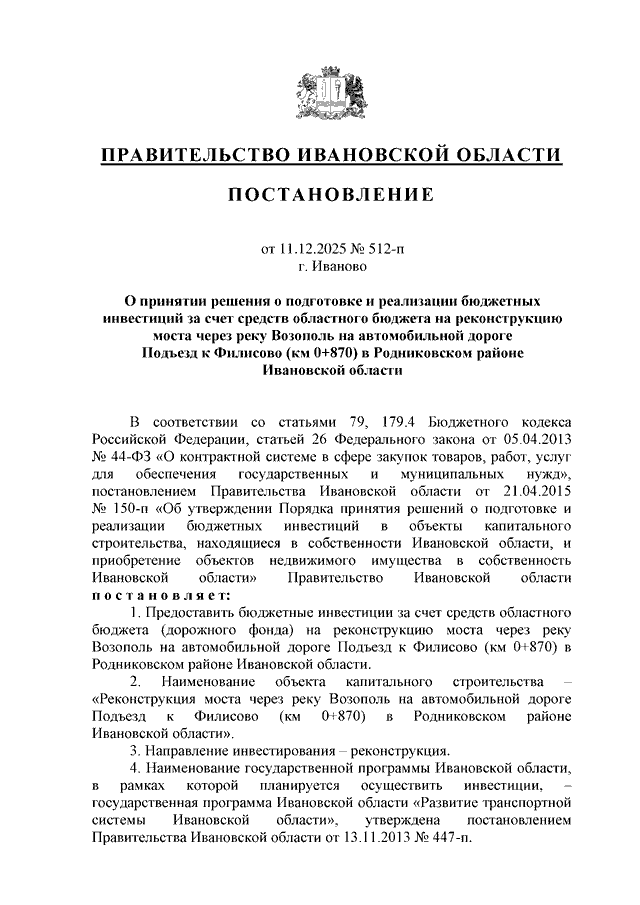 Постановление Правительства Ивановской области от 11.12.2025 N 512-п "О принятии решения о подготовке и реализации бюджетных инвестиций за счет средств областного бюджета на реконструкцию моста через реку Возополь на автомобильной дороге Подъезд к Филисово (км 0 + 870) в Родниковском районе Ивановской области"