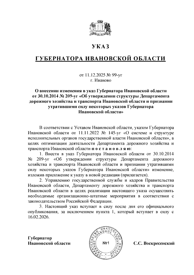 Указ Губернатора Ивановской области от 11.12.2025 N 99-уг "О внесении изменения в указ Губернатора Ивановской области от 30.10.2014 N 209-уг "Об утверждении структуры Департамента дорожного хозяйства и транспорта Ивановской области и признании утратившими силу некоторых указов Губернатора Ивановской области"