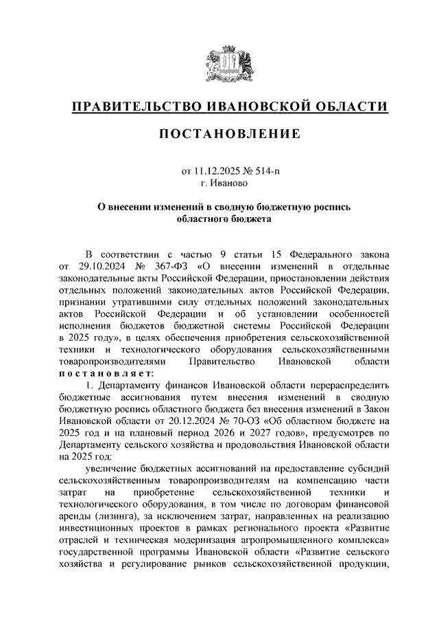Постановление Правительства Ивановской области от 11.12.2025 N 514-п "О внесении изменений в сводную бюджетную роспись областного бюджета"