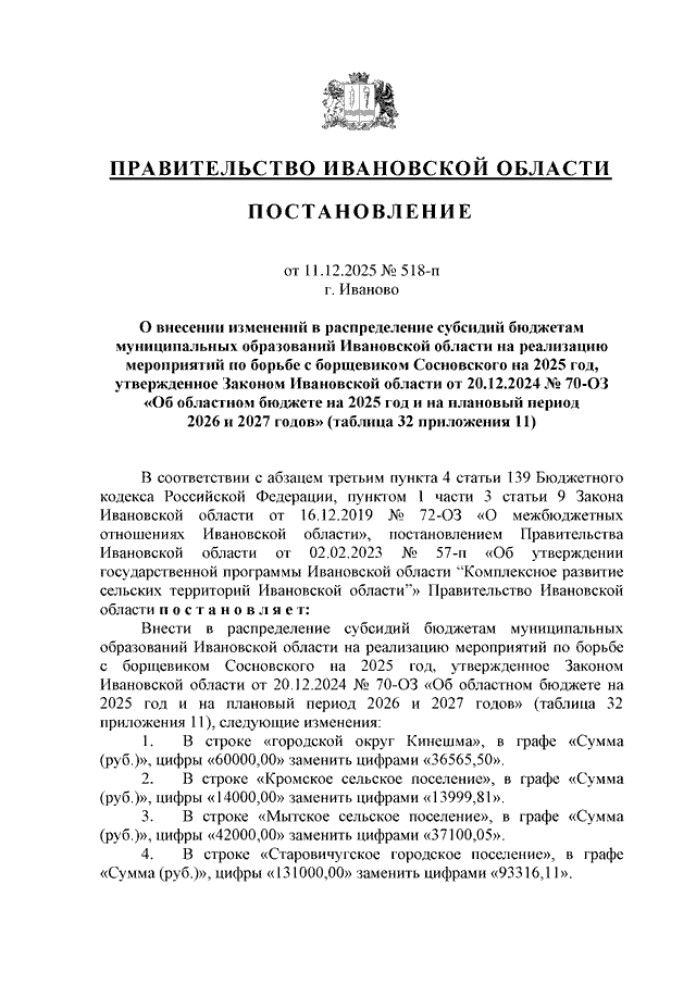 Постановление Правительства Ивановской области от 11.12.2025 N 518-п "О внесении изменений в распределение субсидий бюджетам муниципальных образований Ивановской области на реализацию мероприятий по борьбе с борщевиком Сосновского на 2025 год, утвержденное Законом Ивановской области от 20.12.2024 N 70-ОЗ "Об областном бюджете на 2025 год и на плановый период 2026 и 2027 годов" (таблица 32 приложения 11)"