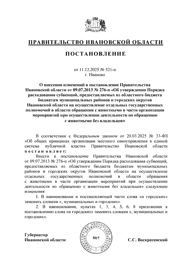 Постановление Правительства Ивановской области от 11.12.2025 N 521-п "О внесении изменений в постановление Правительства Ивановской области от 09.07.2013 N 276-п "Об утверждении Порядка расходования субвенций, предоставляемых из областного бюджета бюджетам муниципальных районов и городских округов Ивановской области на осуществление отдельных государственных полномочий в области обращения с животными в части организации мероприятий при осуществлении деятельности по обращению с животными без владельцев"