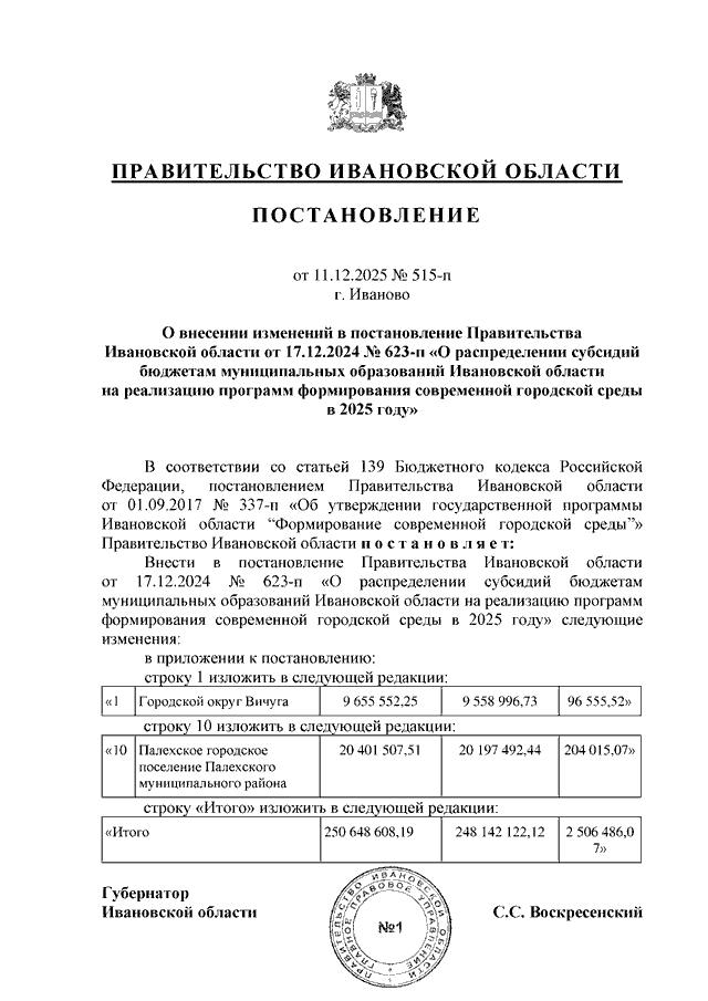 Постановление Правительства Ивановской области от 11.12.2025 N 515-п "О внесении изменений в постановление Правительства Ивановской области от 17.12.2024 N 623-п "О распределении субсидий бюджетам муниципальных образований Ивановской области на реализацию программ формирования современной городской среды в 2025 году"