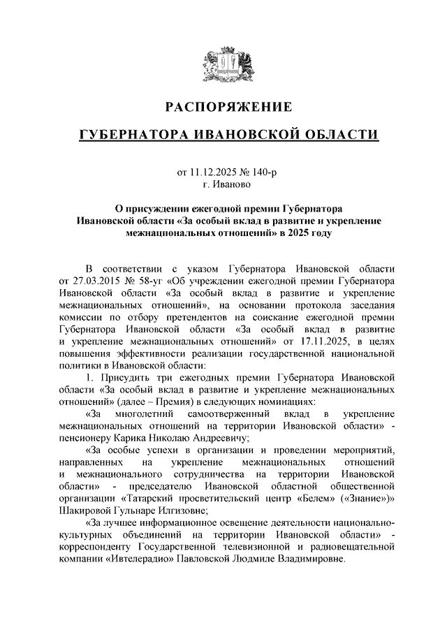 Распоряжение Губернатора Ивановской области от 11.12.2025 N 140-р "О присуждении ежегодной премии Губернатора Ивановской области "За особый вклад в развитие и укрепление межнациональных отношений" в 2025 году"