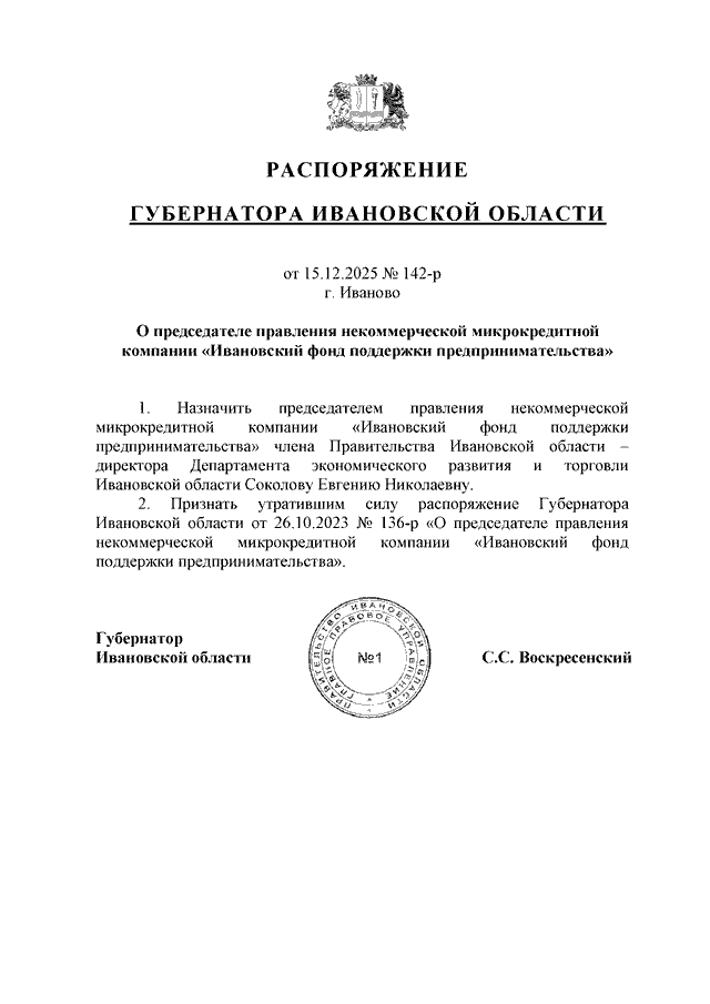 Распоряжение Губернатора Ивановской области от 15.12.2025 N 142-р "О председателе правления некоммерческой микрокредитной компании "Ивановский фонд поддержки предпринимательства"