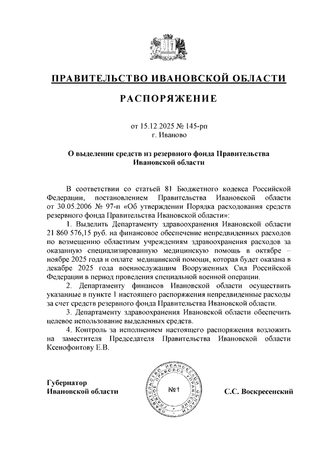 Распоряжение Правительства Ивановской области от 15.12.2025 N 145-рп "О выделении средств из резервного фонда Правительства Ивановской области"