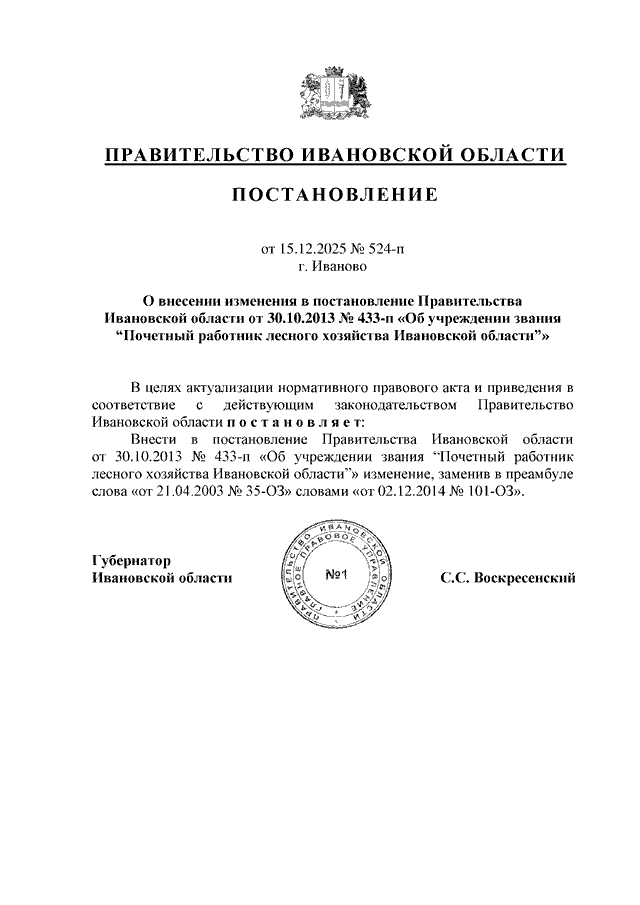 Постановление Правительства Ивановской области от 15.12.2025 N 524-п "О внесении изменения в постановление Правительства Ивановской области от 30.10.2013 N 433-п "Об учреждении звания "Почетный работник лесного хозяйства Ивановской области"
