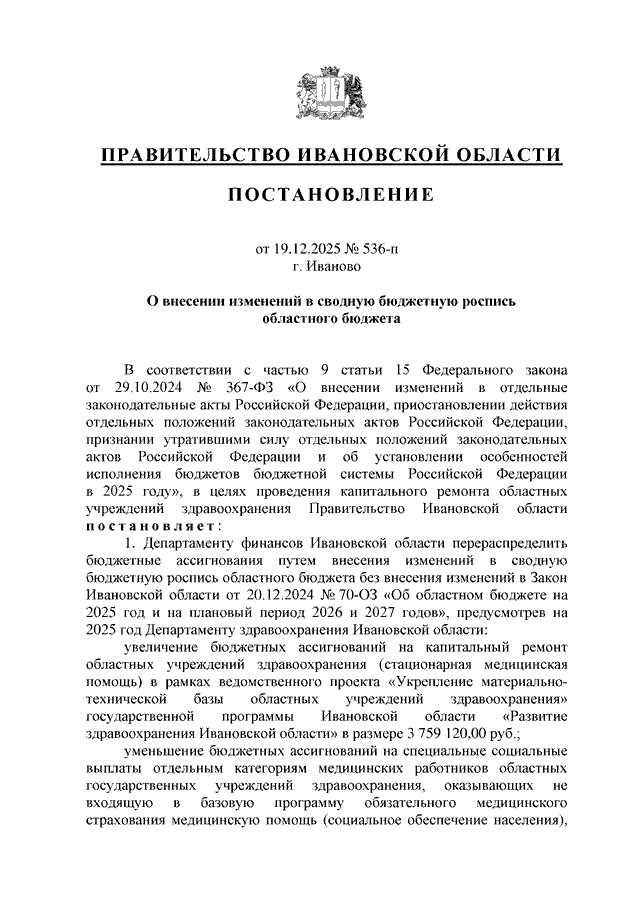 Постановление Правительства Ивановской области от 19.12.2025 N 536-п "О внесении изменений в сводную бюджетную роспись областного бюджета"