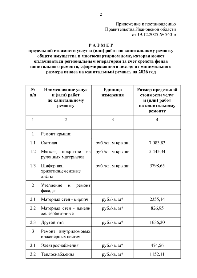 Постановление Правительства Ивановской области от 19.12.2025 N 540-п "Об установлении размера предельной стоимости услуг и (или) работ по капитальному ремонту общего имущества в многоквартирном доме, которая может оплачиваться региональным оператором за счет средств фонда капитального ремонта, сформированного исходя из минимального размера взноса на капитальный ремонт, на 2026 год"