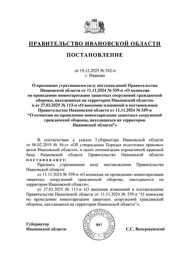 Постановление Правительства Ивановской области от 19.12.2025 N 542-п "О признании утратившими силу постановлений Правительства Ивановской области от 11.11.2024 N 539-п "О комиссии по проведению инвентаризации защитных сооружений гражданской обороны, находящихся на территории Ивановской области" и от 27.03.2025 N 113-п "О внесении изменений в постановление Правительства Ивановской области от 11.11.2024 N 539-п "О комиссии по проведению инвентаризации защитных сооружений гражданской обороны, находящихся на территории Ивановской области"