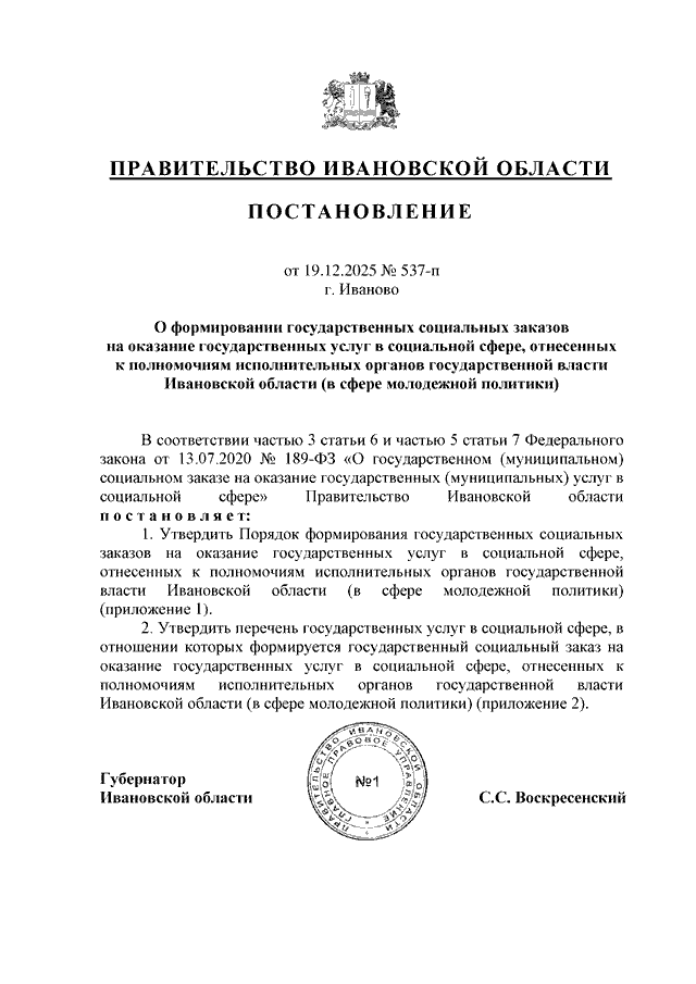 Постановление Правительства Ивановской области от 19.12.2025 N 537-п "О формировании государственных социальных заказов на оказание государственных услуг в социальной сфере, отнесенных к полномочиям исполнительных органов государственной власти Ивановской области (в сфере молодежной политики)" (вместе с "Порядком формирования государственных социальных заказов на оказание государственных услуг в социальной сфере, отнесенных к полномочиям исполнительных органов государственной власти Ивановской области (в сфере молодежной политики)", "Перечнем государственных услуг в социальной сфере, в отношении которых формируется государственный социальный заказ на оказание государственных услуг в социальной сфере, отнесенных к полномочиям исполнительных органов государственной власти Ивановской области (в сфере молодежной политики)")