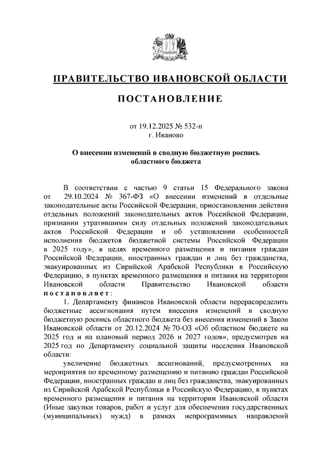 Постановление Правительства Ивановской области от 19.12.2025 N 532-п "О внесении изменений в сводную бюджетную роспись областного бюджета"