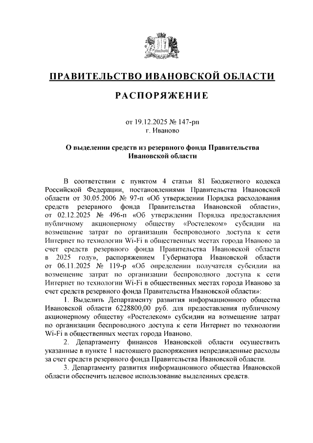 Распоряжение Правительства Ивановской области от 19.12.2025 N 147-рп "О выделении средств из резервного фонда Правительства Ивановской области"