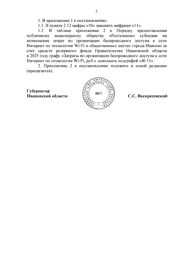 Постановление Правительства Ивановской области от 19.12.2025 N 546-п "О внесении изменений в постановление Правительства Ивановской области от 02.12.2025 N 496-п "Об утверждении Порядка предоставления публичному акционерному обществу "Ростелеком" субсидии на возмещение затрат по организации беспроводного доступа к сети Интернет по технологии Wi-Fi в общественных местах города Иваново за счет средств резервного фонда Правительства Ивановской области в 2025 году" (вместе с "Перечнем общественных мест города Иваново, на которых осуществляется организация беспроводного доступа к сети Интернет по технологии Wi-Fi")
