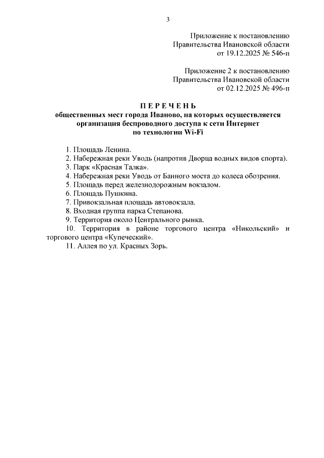 Постановление Правительства Ивановской области от 19.12.2025 N 546-п "О внесении изменений в постановление Правительства Ивановской области от 02.12.2025 N 496-п "Об утверждении Порядка предоставления публичному акционерному обществу "Ростелеком" субсидии на возмещение затрат по организации беспроводного доступа к сети Интернет по технологии Wi-Fi в общественных местах города Иваново за счет средств резервного фонда Правительства Ивановской области в 2025 году" (вместе с "Перечнем общественных мест города Иваново, на которых осуществляется организация беспроводного доступа к сети Интернет по технологии Wi-Fi")