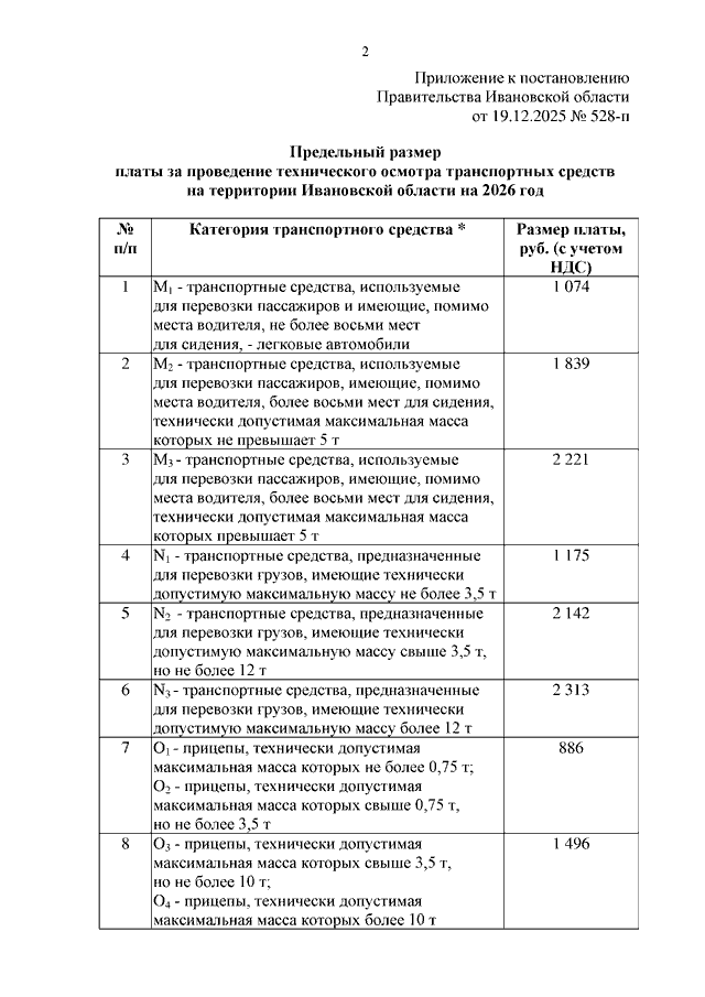 Постановление Правительства Ивановской области от 19.12.2025 N 528-п "Об установлении предельного размера платы за проведение технического осмотра транспортных средств на территории Ивановской области на 2026 год"