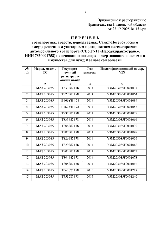 Распоряжение Правительства Ивановской области от 23.12.2025 N 151-рп "Об определении уполномоченного исполнительного органа государственной власти Ивановской области на принятие по договору пожертвования движимого имущества для нужд Ивановской области" (вместе с "Перечнем транспортных средств, передаваемых Санкт-Петербургским государственным унитарным предприятием пассажирского автомобильного транспорта (СПб ГУП "Пассажиравтотранс", ИНН 7830001758) на основании договора пожертвования движимого имущества для нужд Ивановской области")