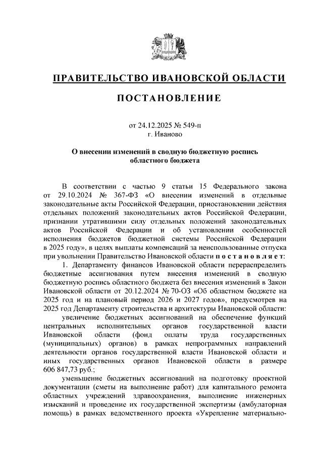 Постановление Правительства Ивановской области от 24.12.2025 N 549-п "О внесении изменений в сводную бюджетную роспись областного бюджета"