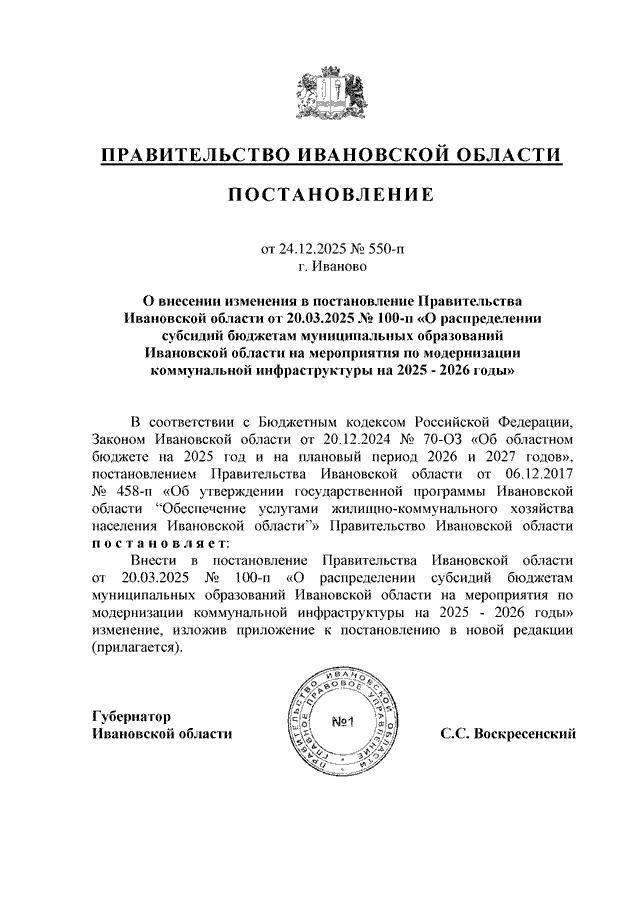 Постановление Правительства Ивановской области от 24.12.2025 N 550-п "О внесении изменения в постановление Правительства Ивановской области от 20.03.2025 N 100-п "О распределении субсидий бюджетам муниципальных образований Ивановской области на мероприятия по модернизации коммунальной инфраструктуры на 2025 - 2026 годы"
