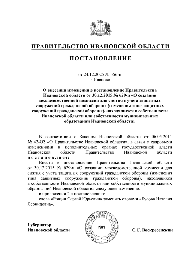 Постановление Правительства Ивановской области от 24.12.2025 N 556-п "О внесении изменения в постановление Правительства Ивановской области от 30.12.2015 N 629-п "О создании межведомственной комиссии для снятия с учета защитных сооружений гражданской обороны (изменения типа защитных сооружений гражданской обороны), находящихся в собственности Ивановской области или собственности муниципальных образований Ивановской области"