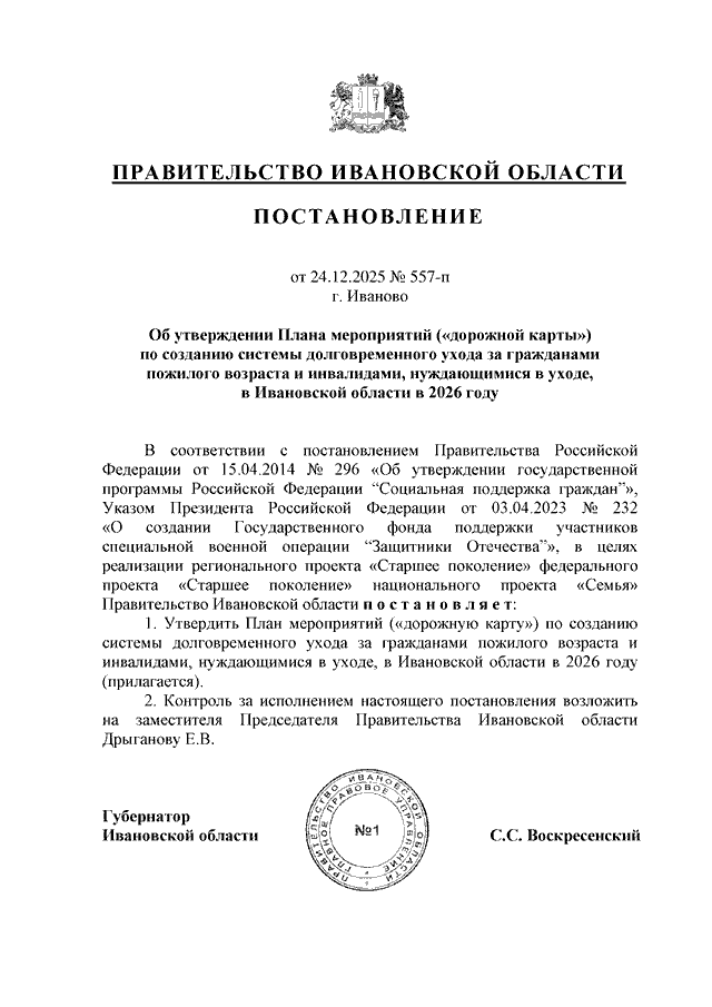 Постановление Правительства Ивановской области от 24.12.2025 N 557-п "Об утверждении Плана мероприятий ("дорожной карты") по созданию системы долговременного ухода за гражданами пожилого возраста и инвалидами, нуждающимися в уходе, в Ивановской области в 2026 году"