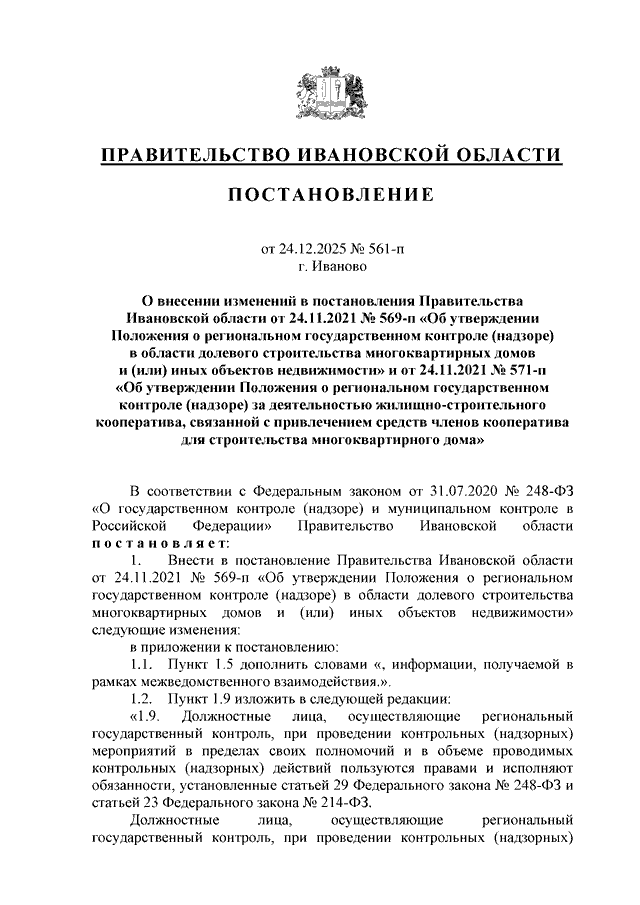Постановление Правительства Ивановской области от 24.12.2025 N 561-п "О внесении изменений в постановления Правительства Ивановской области от 24.11.2021 N 569-п "Об утверждении Положения о региональном государственном контроле (надзоре) в области долевого строительства многоквартирных домов и (или) иных объектов недвижимости" и от 24.11.2021 N 571-п "Об утверждении Положения о региональном государственном контроле (надзоре) за деятельностью жилищно-строительного кооператива, связанной с привлечением средств членов кооператива для строительства многоквартирного дома"