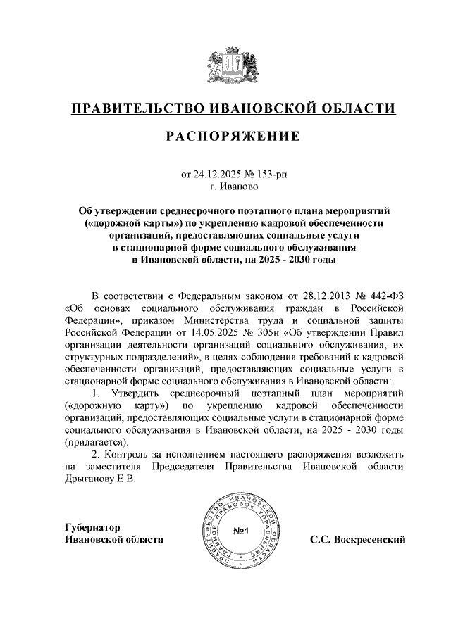 Распоряжение Правительства Ивановской области от 24.12.2025 N 153-рп "Об утверждении среднесрочного поэтапного плана мероприятий ("дорожной карты") по укреплению кадровой обеспеченности организаций, предоставляющих социальные услуги в стационарной форме социального обслуживания в Ивановской области, на 2025 - 2030 годы"