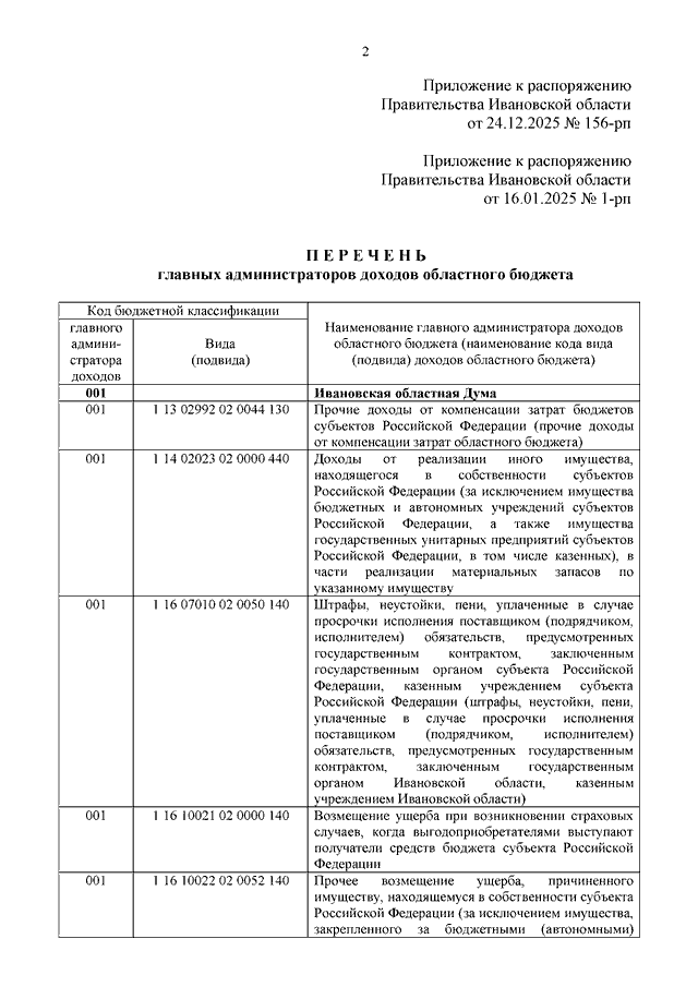 Распоряжение Правительства Ивановской области от 24.12.2025 N 156-рп "О внесении изменения в распоряжение Правительства Ивановской области от 16.01.2025 N 1-рп "Об утверждении перечня главных администраторов доходов областного бюджета"