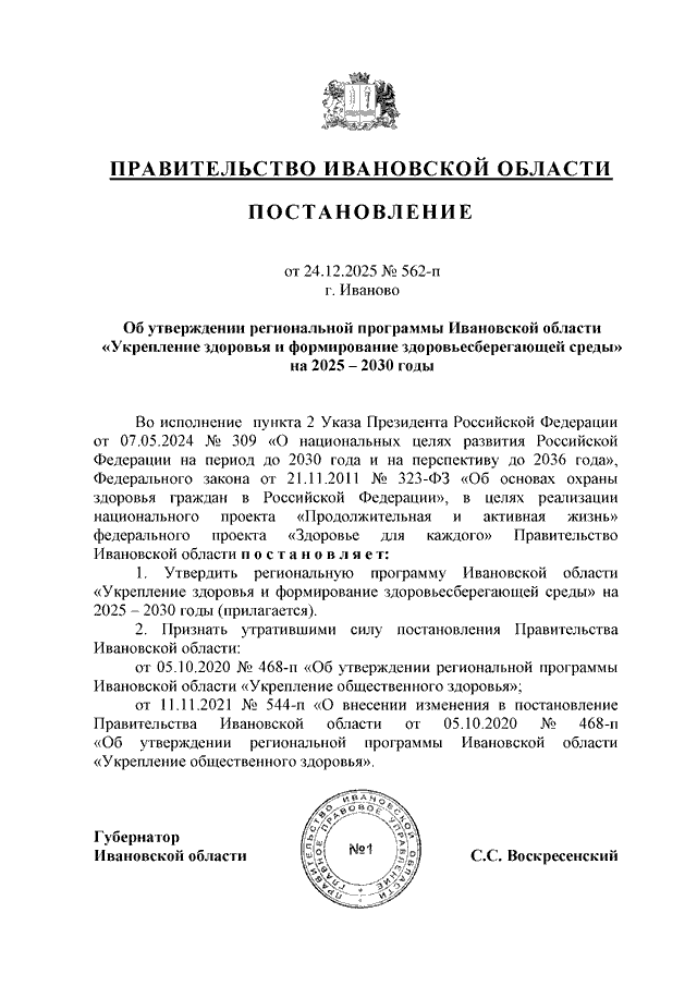 Постановление Правительства Ивановской области от 24.12.2025 N 562-п "Об утверждении региональной программы Ивановской области "Укрепление здоровья и формирование здоровьесберегающей среды" на 2025 - 2030 годы" (вместе с "Региональной программой Ивановской области "Укрепление общественного здоровья и формирование здоровьесберегающей среды" на 2025 - 2030 годы")