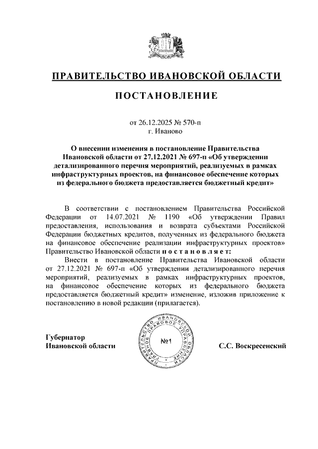Постановление Правительства Ивановской области от 26.12.2025 N 570-п "О внесении изменения в постановление Правительства Ивановской области от 27.12.2021 N 697-п "Об утверждении детализированного перечня мероприятий, реализуемых в рамках инфраструктурных проектов, на финансовое обеспечение которых из федерального бюджета предоставляется бюджетный кредит"