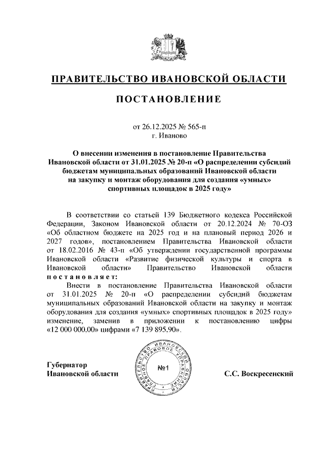 Постановление Правительства Ивановской области от 26.12.2025 N 565-п "О внесении изменения в постановление Правительства Ивановской области от 31.01.2025 N 20-п "О распределении субсидий бюджетам муниципальных образований Ивановской области на закупку и монтаж оборудования для создания "умных" спортивных площадок в 2025 году"