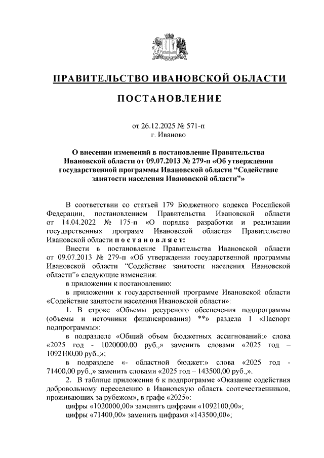 Постановление Правительства Ивановской области от 26.12.2025 N 571-п "О внесении изменений в постановление Правительства Ивановской области от 09.07.2013 N 279-п "Об утверждении государственной программы Ивановской области "Содействие занятости населения Ивановской области"